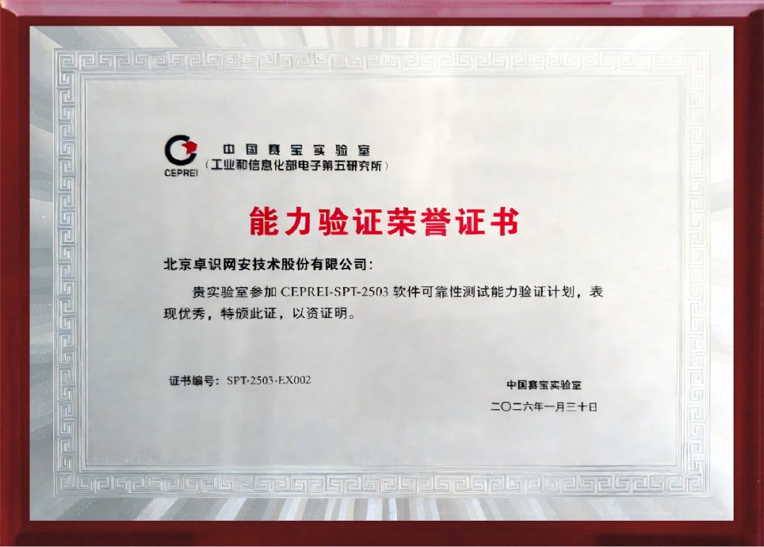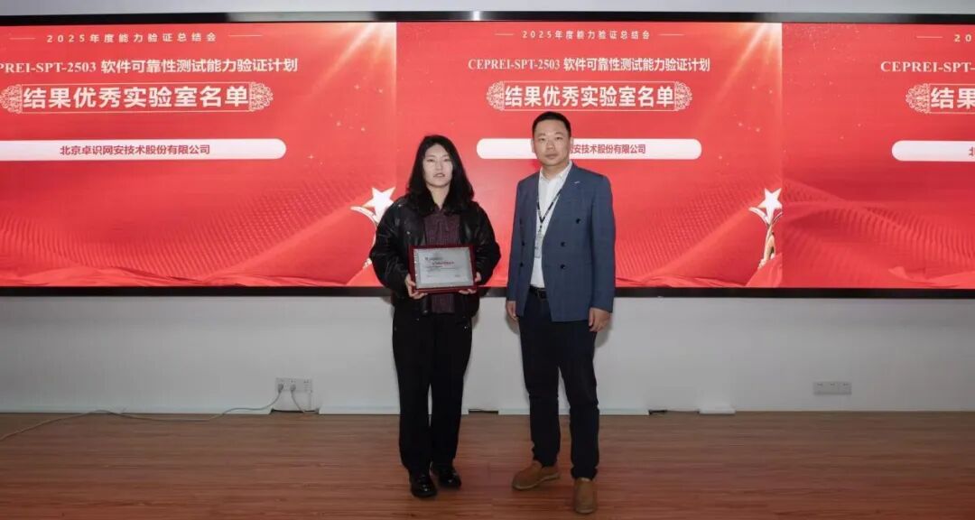 近日,由工业和信息化部电子第五研究所(中国赛宝实验室)主办的“2025年度软件测试能力验证计划总结会暨优秀实验室表彰会”在广州顺利召开。北京卓识网安技术股份有限公司(以下简称“卓识网安”)受邀参会,凭借在2025年度软件可靠性测试能力验证中的突出表现,获评“能力验证优秀实验室”,彰显了其在软件测试与信息安全检测领域的过硬技术实力与行业公信力。作为专注于能源(电力)行业信息安全服务与软件测试的第三方技术服务机构,此次殊荣既是权威机构对卓识网安技术能力的高度认可,也是公司长期深耕技术、坚守匠心的生动见证。